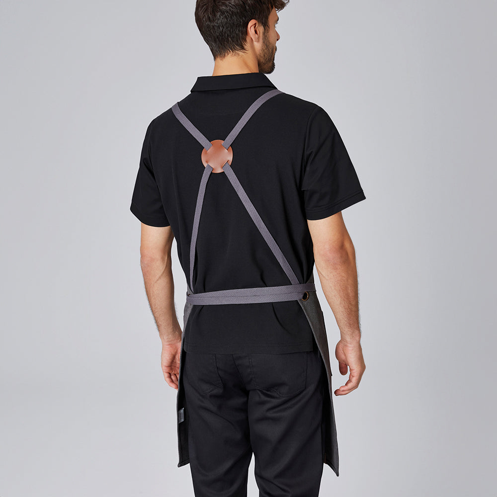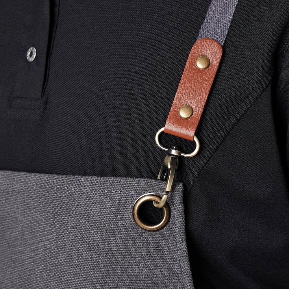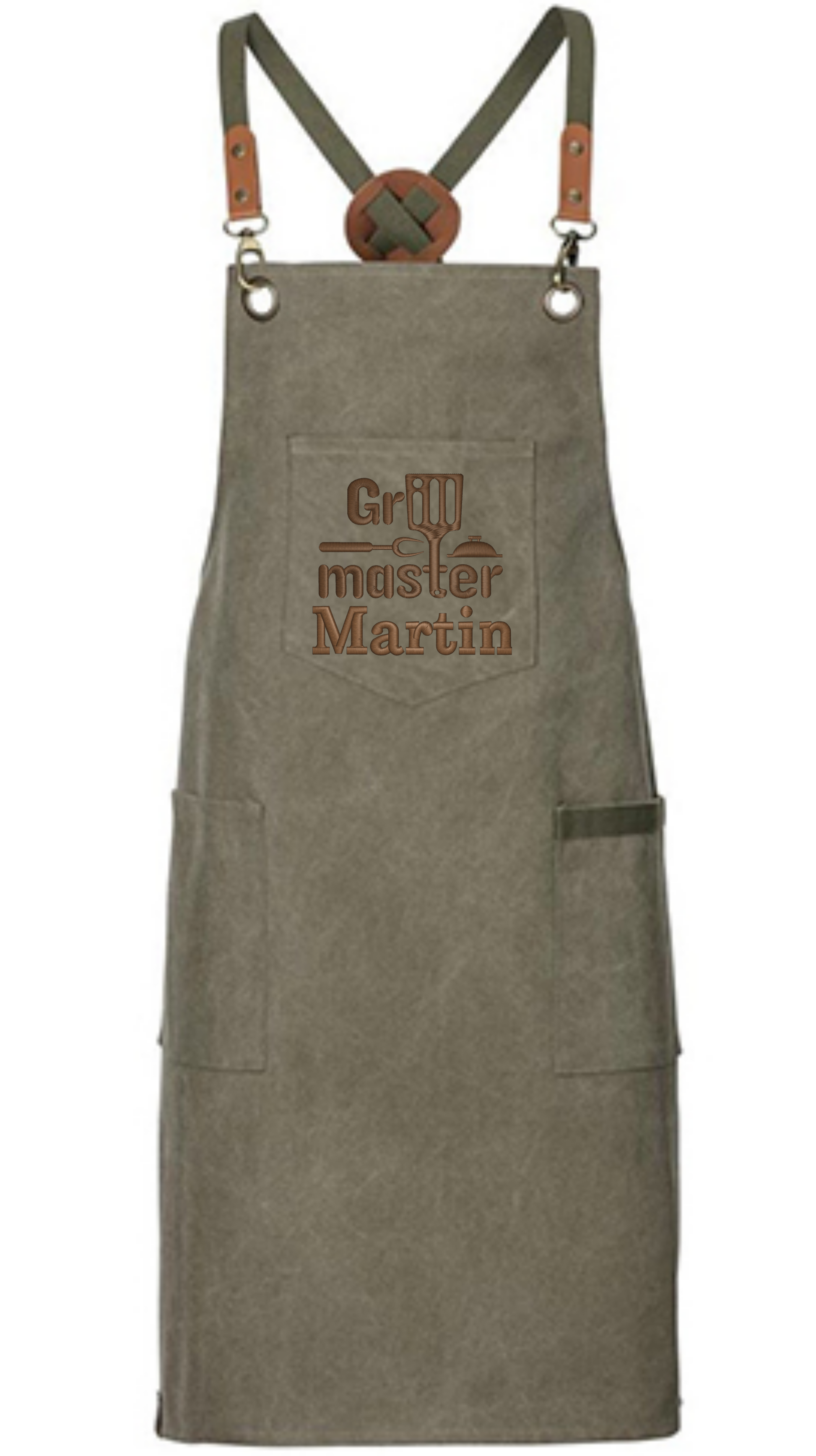 Förklädet har justerbara axelband i kors med snygga detaljer i konstläder som ger en modern och rustik känsla. Den personliga broderingen med namn gör varje förkläde unikt och skapar en minnesvärd gåva.